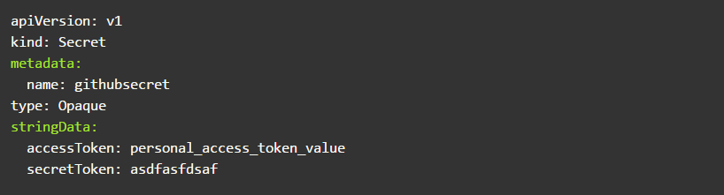 更新 githubsecret.yaml 内容。如果生成的是 personal_access_token_value token, 则需要设置 secretToken 如下: