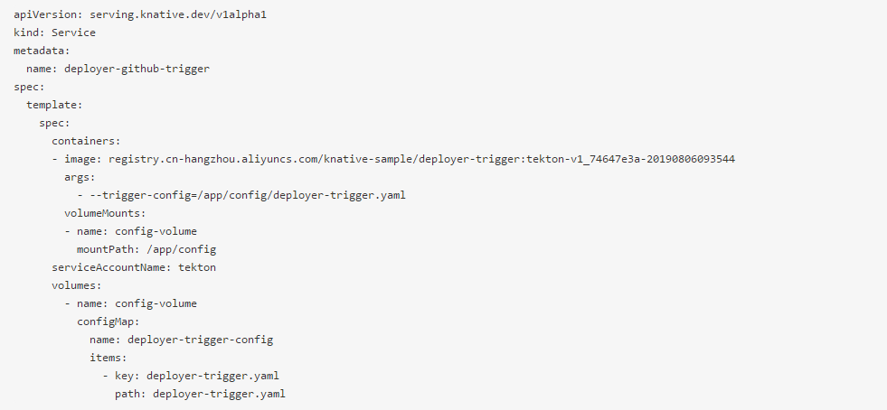 先创建 deployer-github-trigger 服务,用于接收 GitHub 事件,并触发 Tekton Pipeline 构建任务。其中 service.yaml 如下: