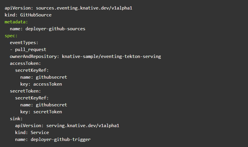 - 目标 Service:sink 字段表示接收到的事件需要发送到哪个 Service , 这里是直接发送到前面定义的 deployer-github-trigger 服务。