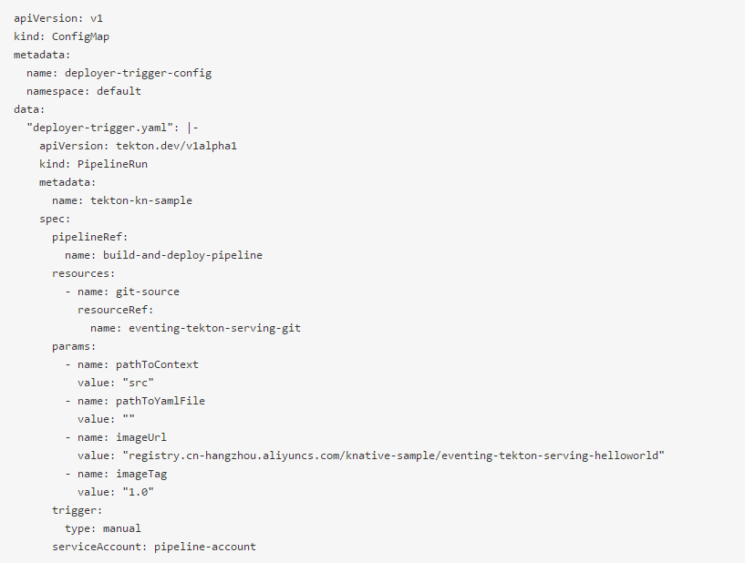 这里通过 ConfigMap deployer-trigger-config, 设置 PipelineRun。deployer-github-trigger 能根据 github Event 信息获取代码仓库的最新信息但不能自动决定 PipelineRun 的定义,所以需要指定一个 PipelineRun 的模板。Trigger 通过 --trigger-config 参数指定 PipelineRun 的模板, 模板内容如下: