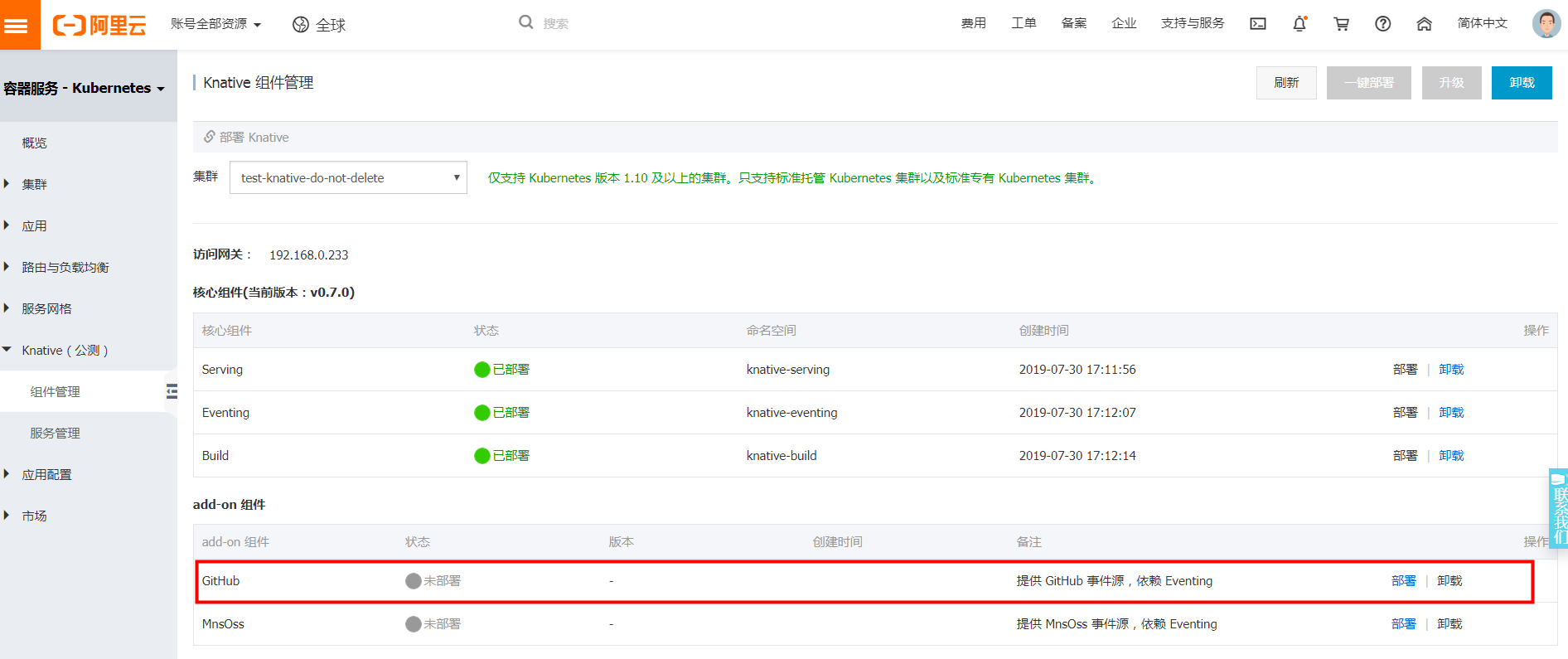 - 部署 GitHub 事件源。阿里云容器服务控制台 Knative 组件管理中选择安装 GitHub 组件,如图所示: