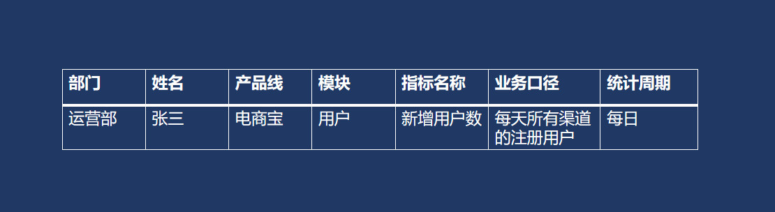 需要有一个规范的流程。我们制定可一个表格来让运营的同事去填,这个表格主要解决是谁,那条产品线,指标的名称是什么,指标的业务口径是什么、统计周期是什么。