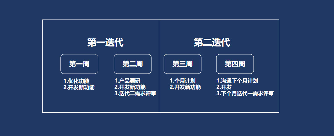 第一个迭代主要做一些优化的功能和一些需求已经十分明确的功能,在第一个迭代产品经理需要完成第二个迭代的需求调研,当完成了需求调研会在第二个迭代的第一周进行需求评审。评审完成后技术的同事就可以进行第二个迭代的开发。