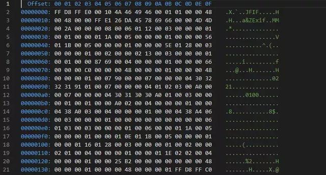 之后差评君又从 Facebook 上下载了几张图片,查看了一下十六进制编码信息。