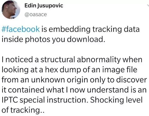 这段话大概意思就是,Facebook 会在用户下载照片时,嵌入一段非常隐蔽的追踪代码,即使用户下载图片通过其他平台传播,Facebook 依旧可以通过这段代码,追查到图片的第一个转发者。