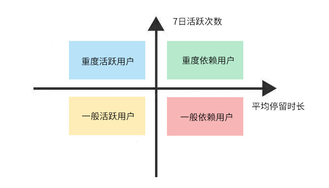用四象限原理,对用户进行分层。通过7日活跃次数和平均停留时长两个指标维度,把用户分层为四类。