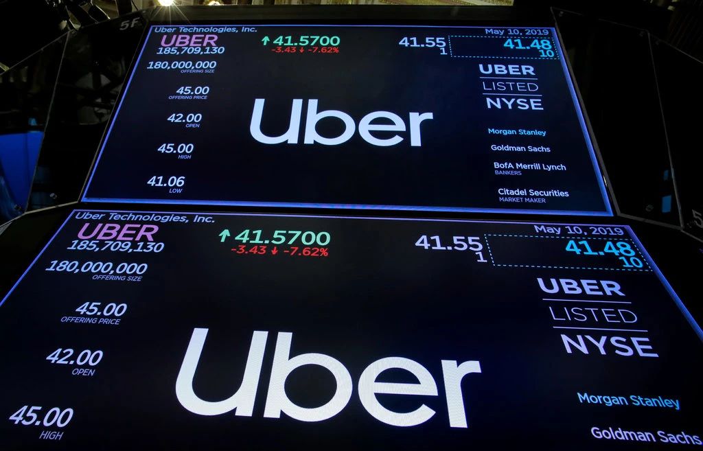 纽约证券交易所,在交易的第一天收盘后显示了优步的标识和价格——图源:Brendan McDermid/路透社