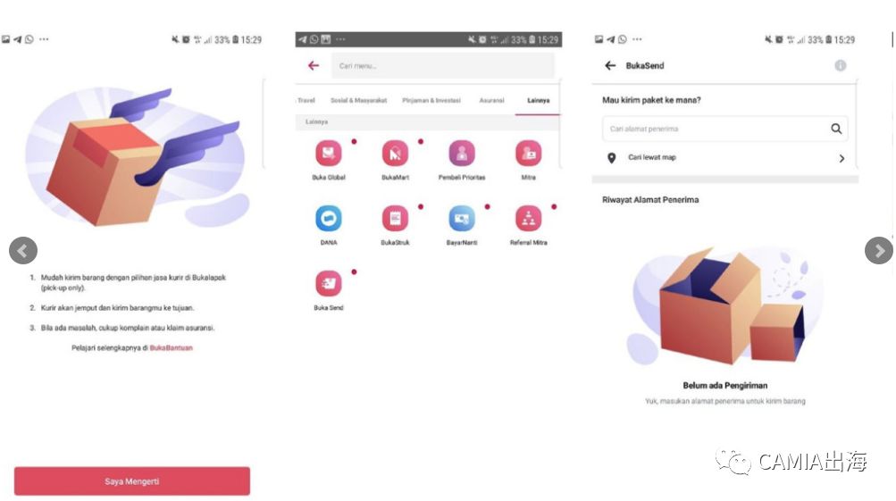 BukaSend仅在应用程序中提供,有两个优点。第一个是“上门取件”允许用户不再需要将货物运送到代理商,因为快递合作伙伴将来到取货地点;第二个是“实时跟踪”,允许用户知道正在交付的货物的位置。