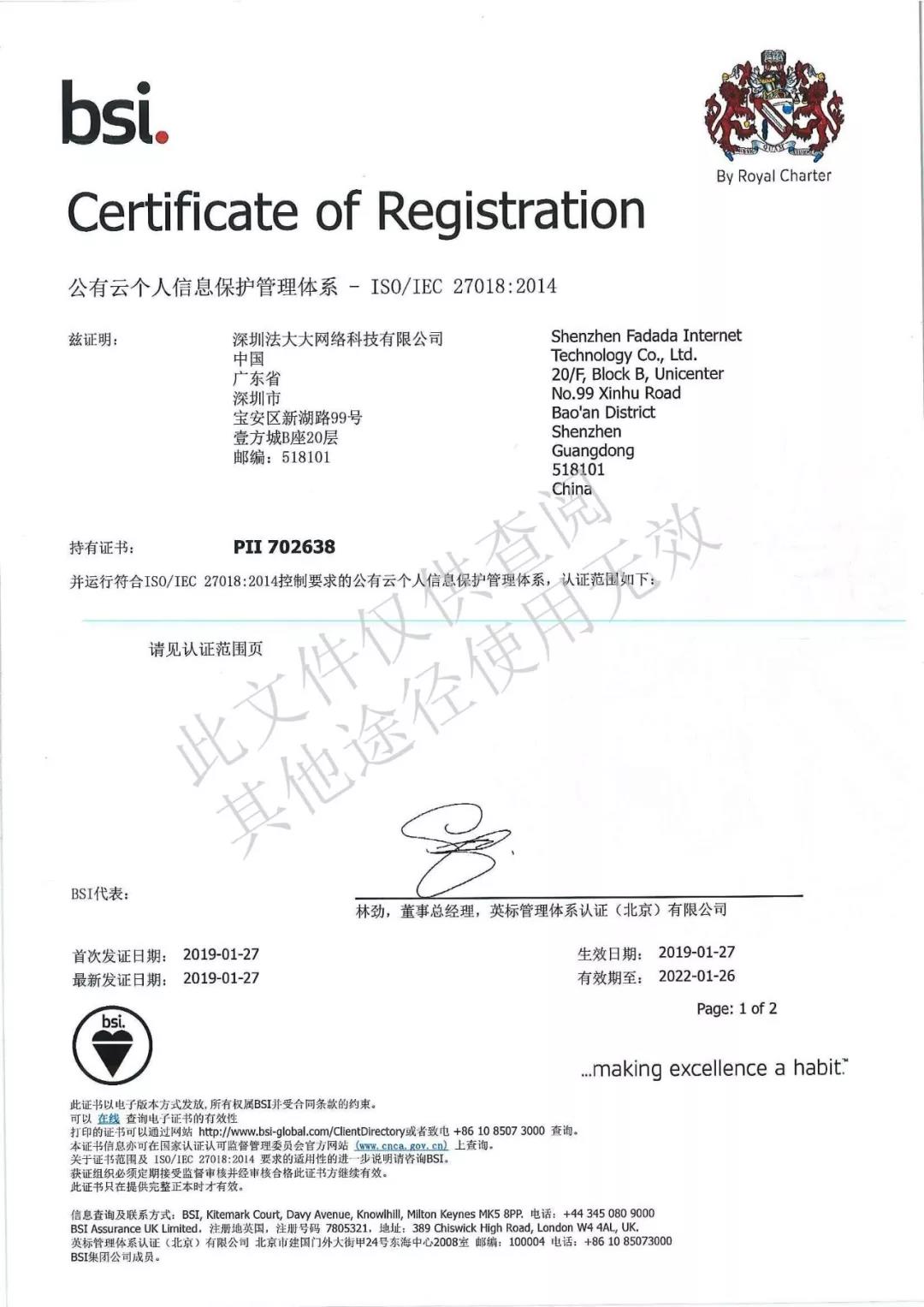 继获得ISO27001信息安全管理体系认证后,法大大于2019年1月历经BSI公正、严格的审核后,又顺利取得了ISO27018关于公有云个人信息保护国际认证(又称“云隐私保护认证”),成为电子合同行业为数不多获得此认证的电子合同服务商。