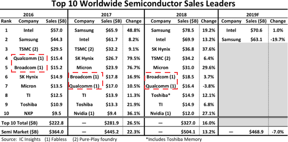 从市场研究公司IC Insights发布的全球半导体销量领导者排名中可以看出,高通和博通在名次上一直不分上下,可见博通收购高通并不是狮子大开口。