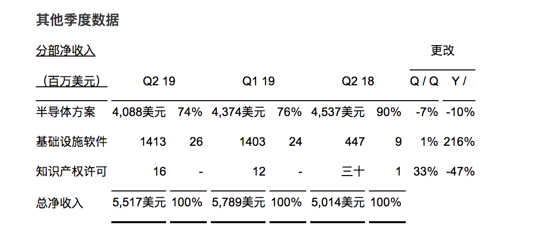 作为智能手机、网络设施最大供应商之一,博通的芯片销量受到手机等硬件厂商的需求波动较大,然而目前全球芯片市场整体在2019年增速放缓,受整个市场环境影响,博通的芯片业务营收环比下滑。