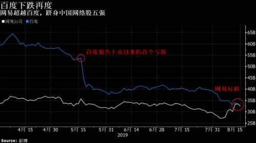 中国第二大网游公司网易(美股NTES)上周发布好于预期的季度业绩,如今市值已超过百度。今年网易股价上涨了11%,而百度则下跌了40%。一度与阿里巴巴(美股BABA)和腾讯并称中国互联网三强的百度,自2018年5月达到峰值以来已经损失了660亿美元市值,相当于一个摩根士丹利。