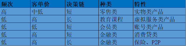 交易类产品主要在三个维度去考量,交易频次、客单价大小、决策路径长短。