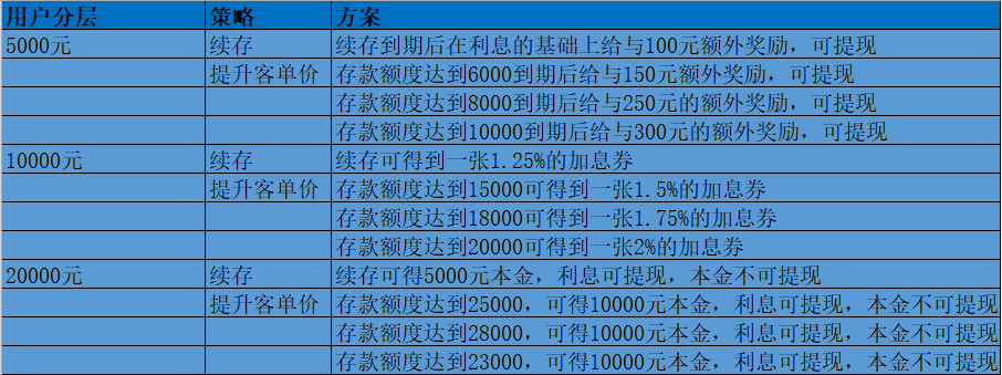 上图策略中可以做ABtest,例如5000原档可以分AB两部分用户给与优惠券和加息券,以此类推。优惠券额度高低也可以做测试,两个维度形成以下四种测试方案