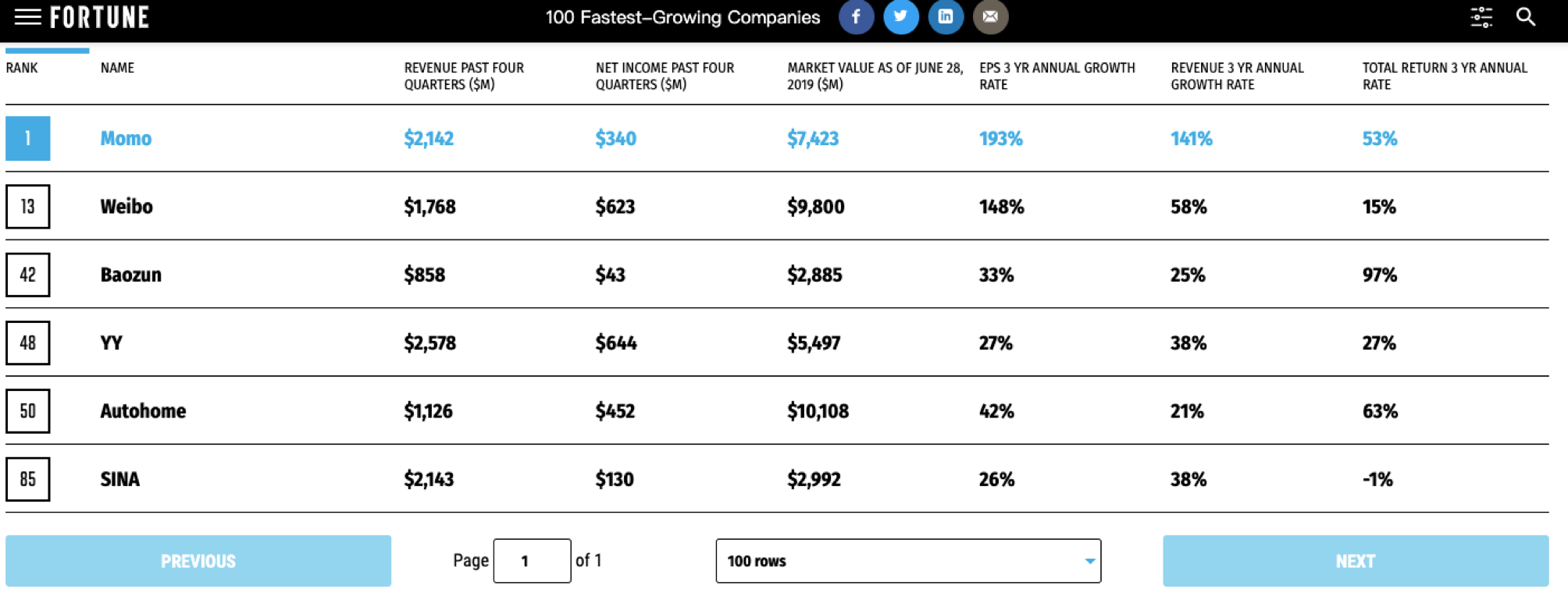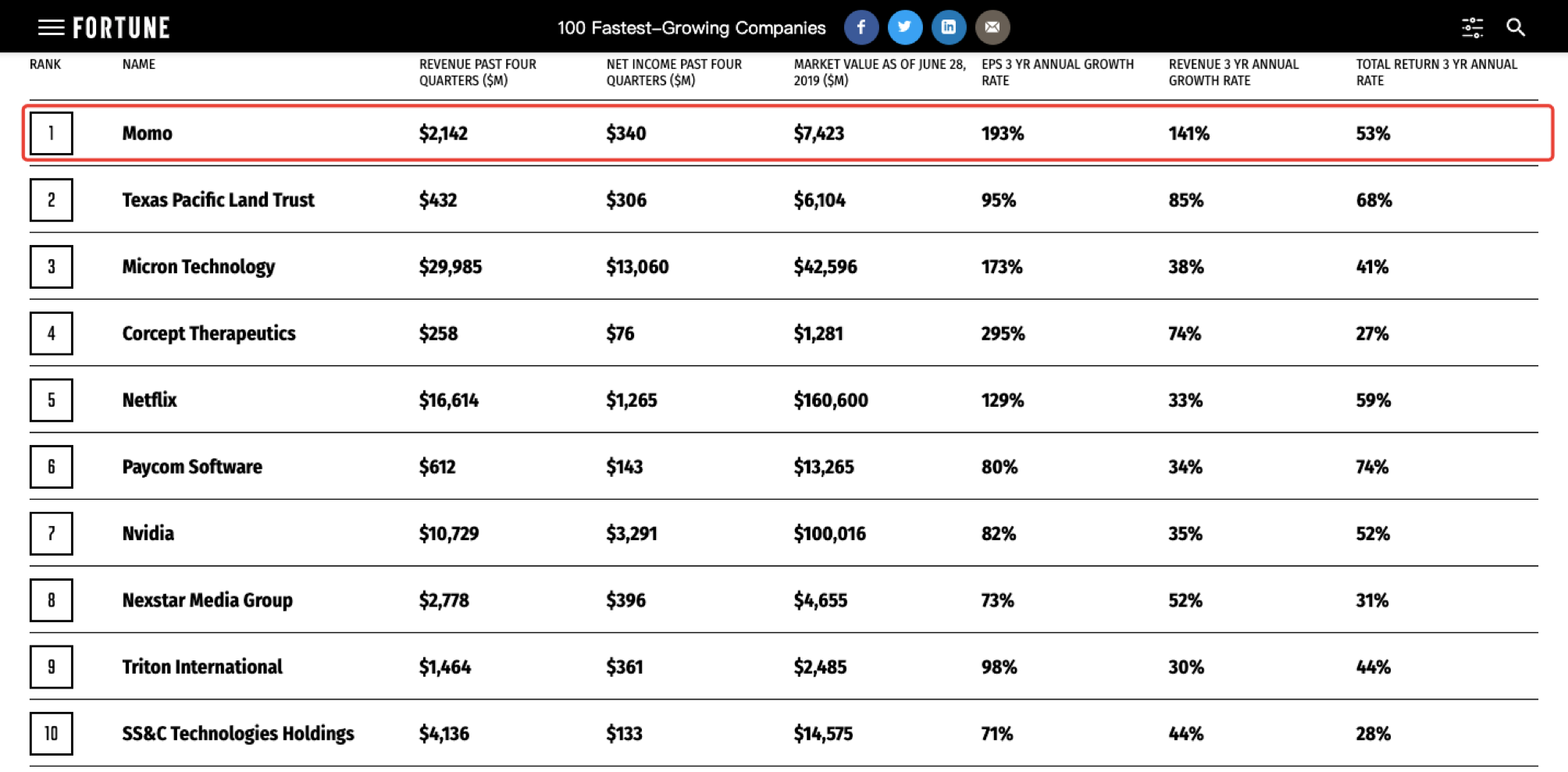 日前,《财富》公布了2019年100家增长最快公司排行榜,大家耳熟能详的陌陌跻身这一榜单榜首,这也是中国公司第一次跻身这一榜单榜首。