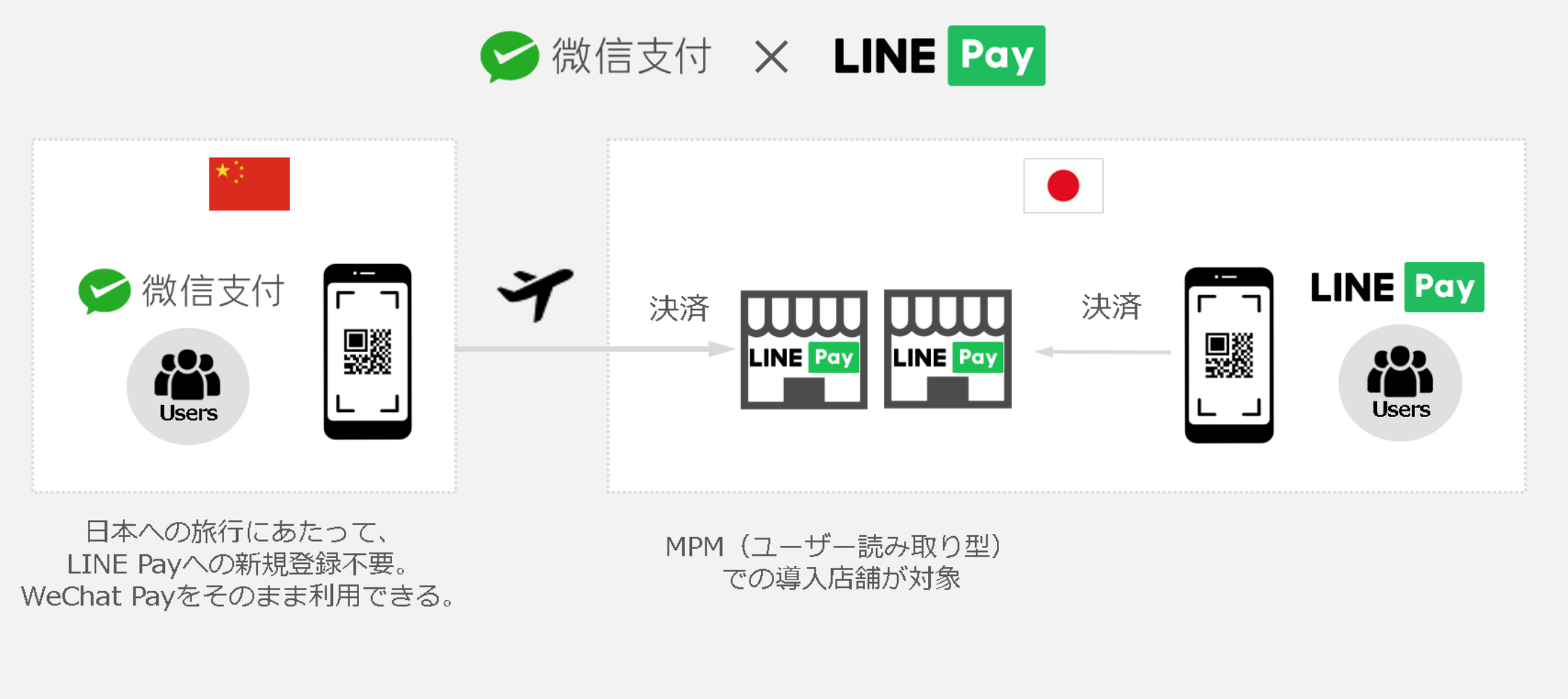 在日本,微信支付和 LINE Pay 打通了合作,消费者用微信扫描 LINE Pay 的二维码也可调用微信钱包的余额、零钱通或借记卡进行支付(暂不支持信用卡),也就是说,能用 LINE Pay 付款的地方,也支持微信支付了。