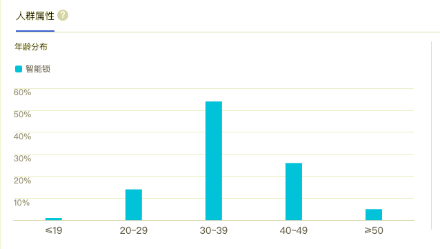 从年龄上来看,搜索智能锁最多是30-39岁的人,占比超过了50%;其次是40-49岁的人,占比在28%左右;排在第三的是20-29岁的人,占比在14%左右。从数据可以看出,30-49岁的中年人是智能锁消费的主力军,因为他们工作稳定,收入相对较高。