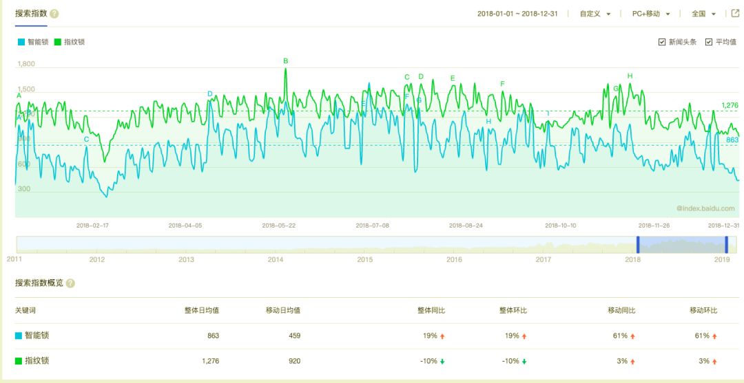 从2016年的数据来看,关键词“智能锁”在百度的整体日均搜索指数为461,移动端为178;“指纹锁”关键词在百度的整体日均指数为1513,移动端为974(见上图)。