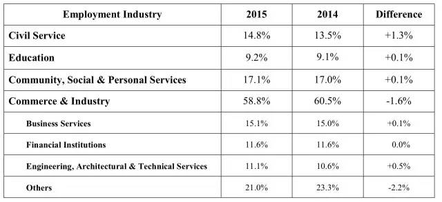 加上Business Services(商业服务)、Financial Institution(金融机构),更是达到了85.5%,如此一来,既符合香港自身一贯商业、金融的定位,也和香港90%左右的服务业占比是吻合的。