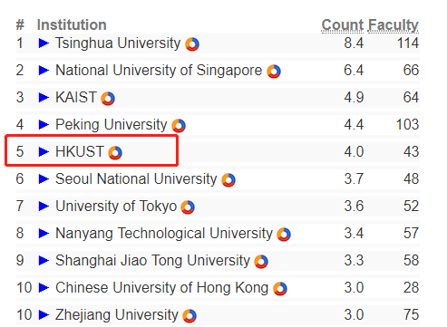 一座以科技命名的顶级高校,科技水平到底怎么样?在CSRankings上检索计算机科学(含从AI到可视化在内的所有子专业),时间跨度2009到2019,检索结果,香港科技大学排在亚洲第五,国内只有清华北大在港科大前面。