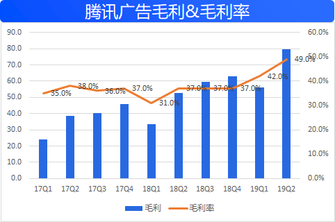 当然,腾讯广告整体增速在下滑的同时,并非没有亮点,广告部分的毛利率提升到了历史最高水平,很大程度上提高了收入成色。