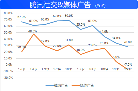 腾讯在财报中写道,社交及其他广告的增长主要是微信朋友圈和QQ看点以及移动广告联盟带来的,媒体广告同比下降是因为去年同期有FIFA世界杯赛,环比上升是较上一季播出更多连续剧与自制综艺节目而带来的收入。