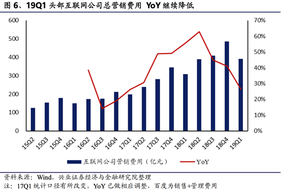 从广告源头上看,兴业证券统计了整体营销费用较多及偏好投互联网媒体的行业A股上市公司(除去银行),2019Q1的整体销售费用同比增长12.7%,低于18Q1的20.6%。这个数字在Q2环比会回升,但同比仍不容乐观。