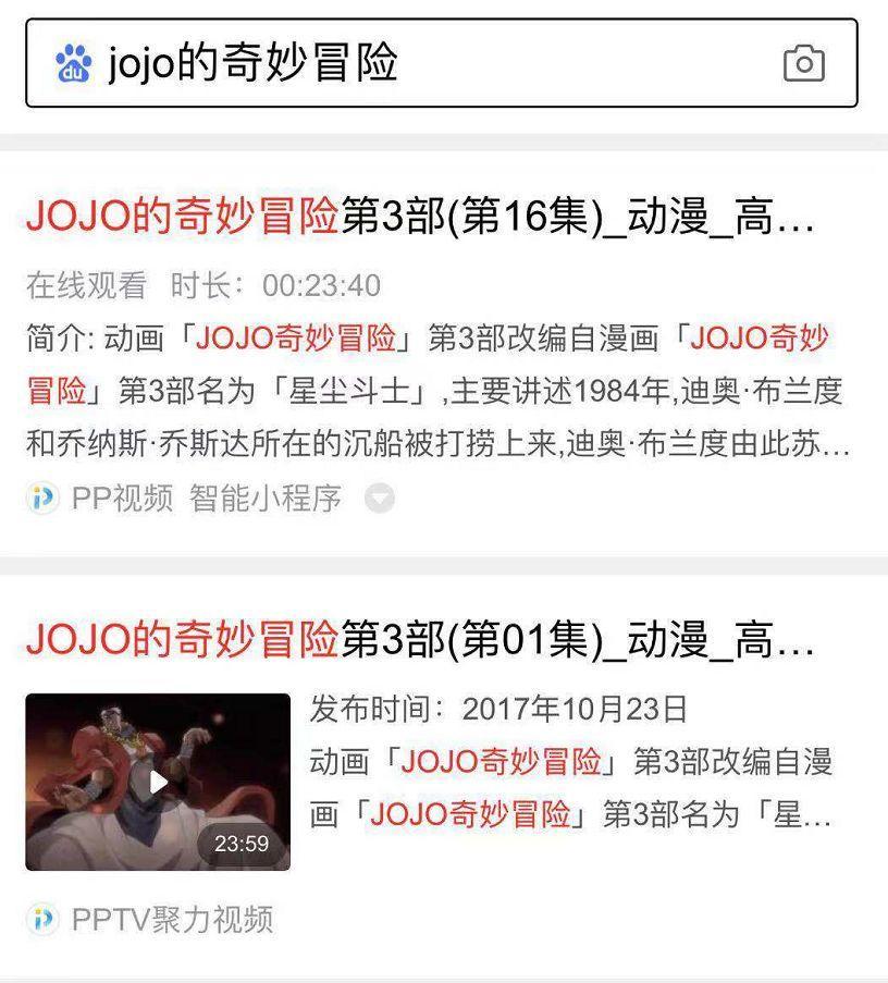 区别于传统的小程序启动方式(用户需要输入准确的小程序名称或者找到小程序页面),今年3月,百度开始在搜索结果中全面接入智能小程序,增加了搜索内容与小程序的相关性,比如用户在百度搜索框内输入“JOJO的奇妙冒险”,能够提供动画播放的PPTV小程序就会优先出现在结果页面中。