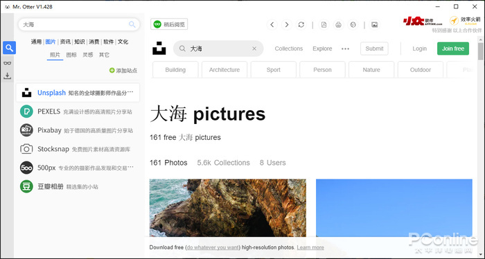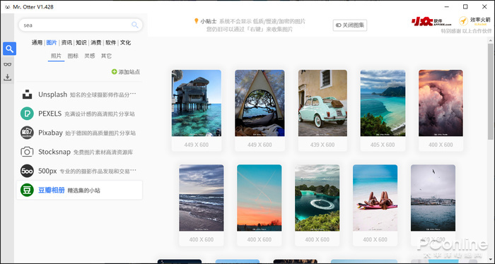 Mr. Otter还为用户准备了图片这个大的搜索分类,特色就是可以帮助用户在多个高质量图片分享站点中查找图片,除了图片,Mr. Otter还细分出来了图标以及灵感小分类。