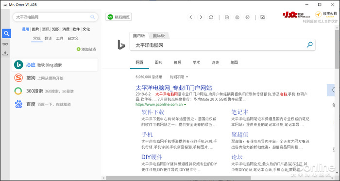 [PConline应用]正所谓术业有专攻,有经验的用户一般都会用不同的搜索引擎来搜索查找不同的资源内容,以便更快更好的找到自己需要的东西。现在有了一款综合的搜索工具,可以帮你大大的加快搜索效率,免除了多个搜索引擎来回切换的麻烦,这个搜索工具名叫Mr. Otter,它有啥特色功能呢?请跟着小编来体验一下吧。