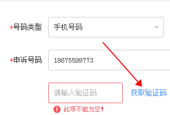打开申诉页面后,首先填写上自己被标记为骚扰电话的号码,点击‘获取验证码’按钮。