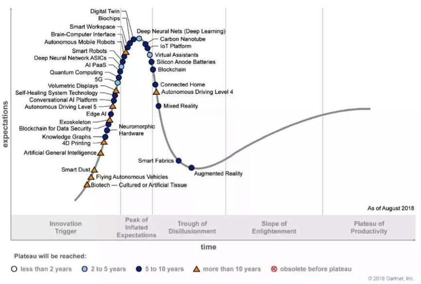 Gartner 2018年8月发布的《Hype Cycle for Emerging Technologies, 2018》表明,知识图谱、智能工作空间、智能机器人、对话式AI平台等智能技术,预计还要5-10年才能达到高峰。