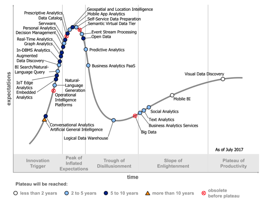 例如Gartner在2017年7月发布的《Hype Cycle for Analytics and Business Intelligence, 2017》报告中就表明,未来的BI将以增强分析为主要着力点,增强数据发现、自然语言生成等技术将会在2-5年内达到高峰。值得注意的是,Gartner的预测偏向于整体的趋势,然而不同国家、地区的BI发展不尽相同,如今这些技术仍处于发展阶段,至少在我国是这样。