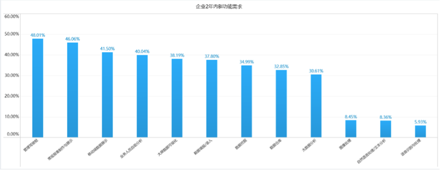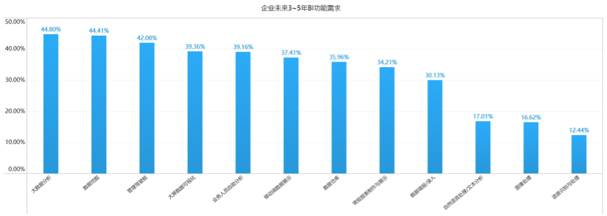 最近,帆软数据应用研究院对1000多家企业进行了BI功能需求调研。调研结果表明,在企业2年内最需要的BI功能中,图像处理、语音工程和文本分析等功能排在最后。并且,企业未来3~5年将会应用的BI功能也呈现相同的结果,只是比例有所上升。所以说,我国企业的BI建设在未来5年内将仍然以数据管理和分析为主。