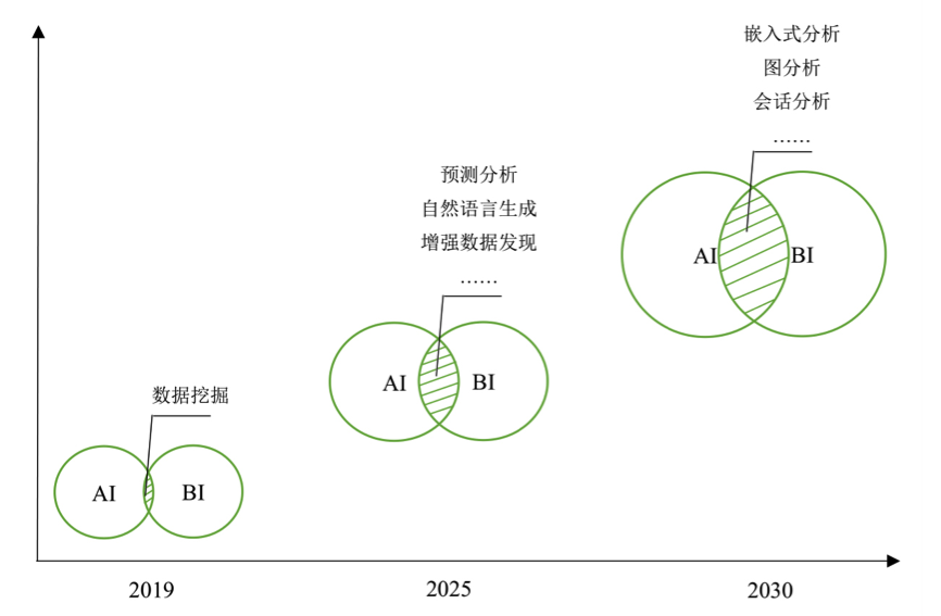 当前在中国,AI与BI仅存在极小的重合部分,随着AI技术和BI系统的不断成熟,AI在BI中的应用将会越来越多,二者重合的部分也越来越多,但是因为它们存在本质上的区别,因此不会完全重合。预计在2025年左右,BI将开始迈入智能化阶段,到2030年,BI的智能化也将进一步扩大。
