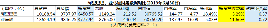 这张表是根据截至2019年6月30日阿里、亚马逊的财务报表数据制作的。
