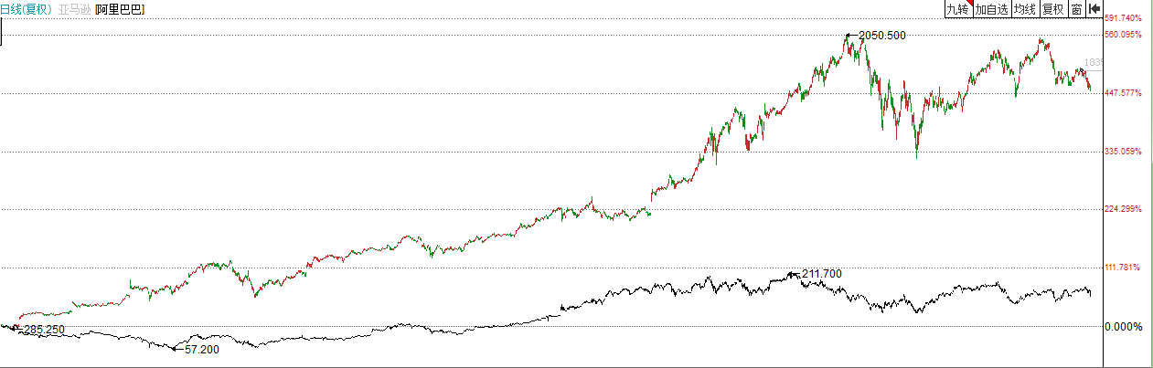 阿里巴巴成立1999年,亚马逊成立于1995年,前后仅差了4年时间。但如今,阿里的市值却比亚马逊差了一个阿里。
