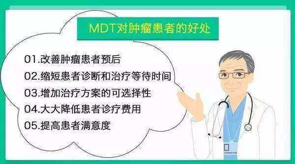 现代医学技术发展日新月异,特别是越大型的医院,其学科分类越来越细,出现更多的专科和亚专科。专科细分给患者带来专业诊疗服务的同时,也出现一些弊端。如不同专科的医生各自为战,他们往往只熟悉自己的专业领域,对其他领域不甚了解,这样显然不利于患者得到综合诊疗。MDT模式具有最大限度减少患者的误诊误治,缩短患者诊断和治疗等待时间、增加治疗方案的可选择性、制定最佳治疗手段,改善肿瘤患者预后,同时避免了不停转诊、重复检查给患者家庭带来的负担,从而提高患者满意度。现在很多常见肿瘤治愈率的提高,和多学科诊疗(MDT)的应用是分不开的。
