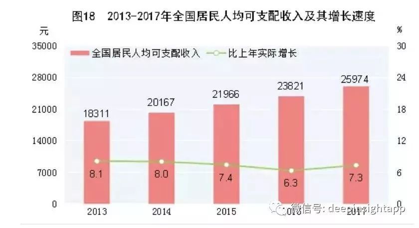 看完了美国人,我们再看看中国人“到底有多穷”。之前在我们对拼多多的分析中,将中国收入人群分为五个大组:高收入人均可支配收入64934元,中等偏上收入可支配为34547元,中等收入可支配为22495元,中等偏下收入可支配为13843元,低收入可支配为5958元。也就是说,最高收入人群,一个月可支配收入也不过5000多。而2017年全国居民的人均可支配收入只有25974元。