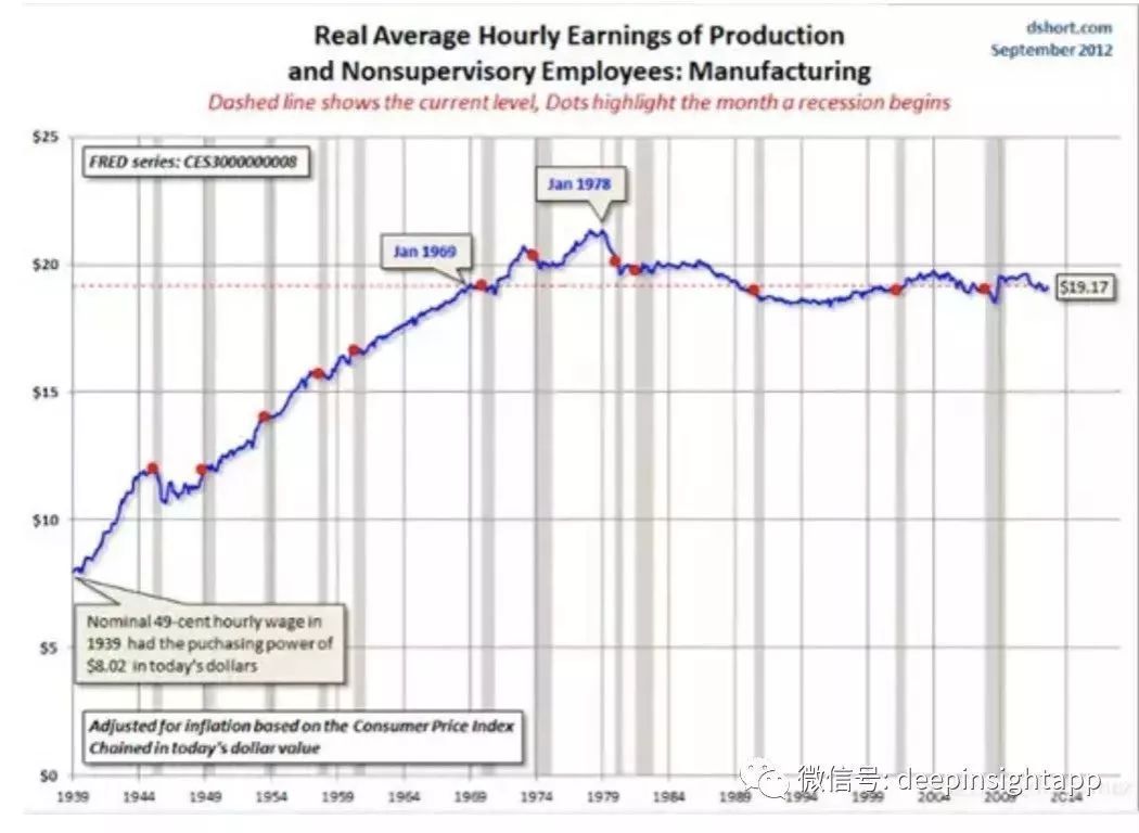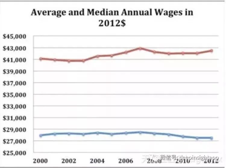 全球化带来的是美国制造业工人失业,或者收入大幅下滑。全美在制造业的就职人数为1232万人,仅次于政府部门雇员的2200万人,第三大是零售行业的人。我们看到,在新经济和全球化推动下,我们就业最大的几个行业都受损的。所以大家要选特朗普当总统,让制造业回归。未来说不定还要打压亚马逊,让传统零售回归。制造业就业人口在1979年达到了1960万,到了2012年只有1220万人。而且这些人的平均收入过去30年是下滑的!
