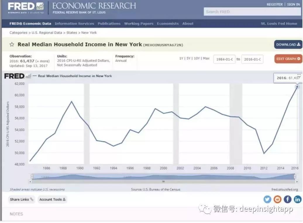 我们再来看看美国的家庭有“多穷”。我们看到2016年的数据,家庭是零资产或者是负资产的占比达到了30.4%。也就是说,美国有差不多三分之一家庭资产是负的,不是正现金流。负债远远超过了其持有的资产。这一点我们后面还会提到。美国是全世界提前消费最强的国家。没什么东西都是长期贷款。那么纽约家庭的收入如何?作为全美最富有的一个州,2016年纽约家庭中位数收入为61000美元,相当于37万人民币。也就是一个月三万人民币的收入。