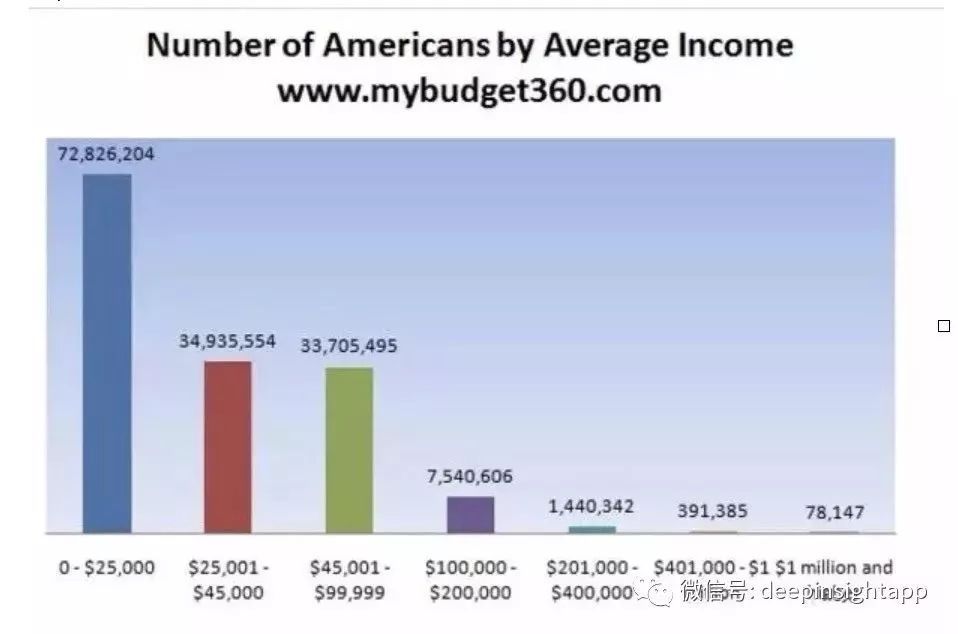 我们先看美国人的收入水平,在美国年收入10万美元以上已经达到了全美收入最高钱95%的水平。这个收入差不多是60多万人民币(税前)一年。作为一个家庭,如果家庭年收入在10万美元以上,也已经超过了90%的美国家庭。而美国有一半人群的收入只有2.5万美元,差不多是12万人民币。也就是国内一个月一万人民币的工资。