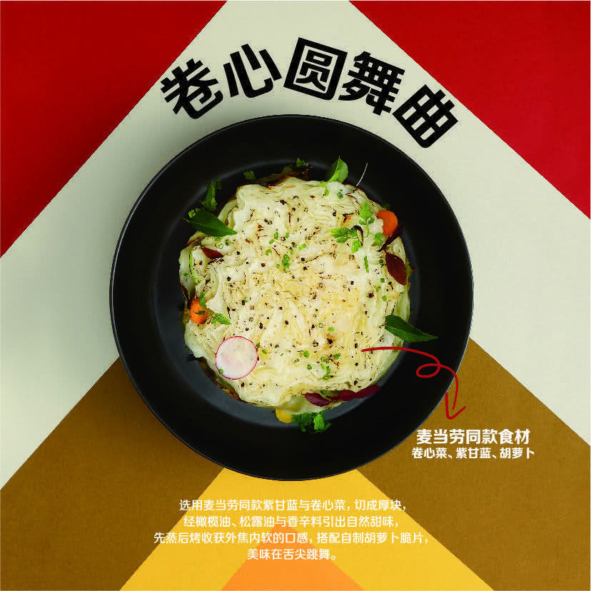 比如今年菜单上的“卷心圆舞曲”就用了麦当劳鲜蔬杯里的同款紫甘蓝和胡萝卜,而主菜“红黄对对碰”里的牛肉则是麦当劳安格斯牛肉堡同款。