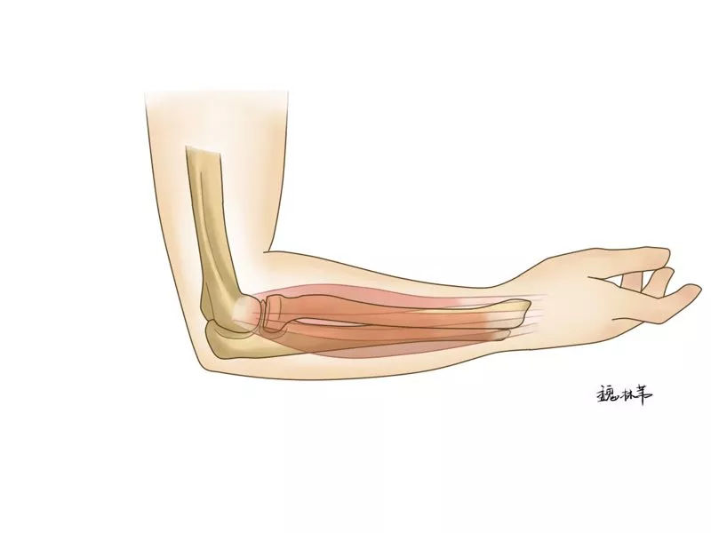 另外一个阶段就是经过这些保守治疗,效果不好了以后怎么办?但是我要告诉大家一个前提,以我的临床,个人的临床经验来看,绝大多数的病人经过最开始我说的那个治疗,几乎都是完全可以好转的。对了,还可以给大家补充一下,我们临床上还有一些办法,就是比如说我们对,我们刚才说的伸腕的这个肌腱的支点进行牵拉,就是这样。我们把手腕往下,用这个好手去掰它,牵到,这时候你会往往感觉到这个肘关节很疼,但是没有关系,你只要持续进行牵拉,每天牵拉一些次数,它也可以帮助我们缓解网球肘。