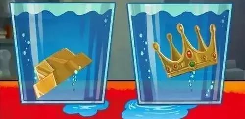 国王做了一顶金王冠,他怀疑工匠用银子偷换了一部分金子,便要阿基米德鉴定它是不是纯金制的,且不能损坏王冠。阿基米德捧着这顶王冠整天苦苦思索,有一天,阿基米德去浴室洗澡,他跨入浴桶,随着身子浸入浴桶,一部分水就从桶边溢出,阿基米德看到这个现象,头脑中像闪过一道闪电:“我找到了!”