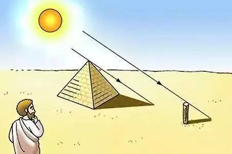 法老问泰勒斯用什么工具来量金字塔。泰勒斯说只用一根木棍和一把尺子,他把木棍插在金字塔旁边,等木棍的影子和木棍一样长的时候,他量了金字塔影子的长度和金字塔底面边长的一半。把这两个长度加起来就是金字塔的高度了。泰勒斯真是世界上最聪明的人,他不用爬到金字塔的顶上就方便量出了金字塔的高度。