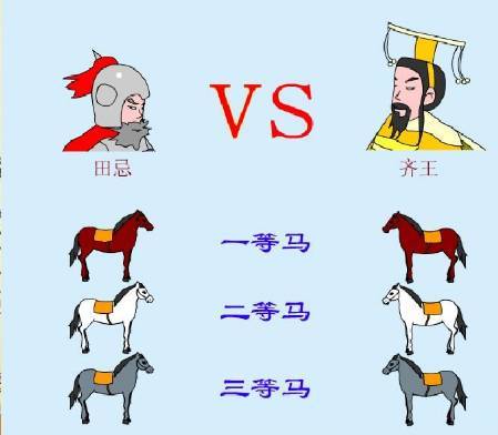 战国时期,齐威王与大将田忌赛马,齐威王和田忌各有三匹好马:上马,中马与下马。比赛分三次进行,每赛马以千金作赌。由于两者的马力相差无几,而齐威王的马分别比田忌的相应等级的马要好,所以一般人都以为田忌必输无疑。