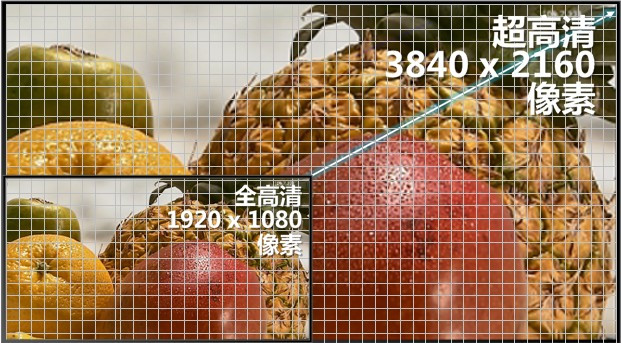 UHD和4K的概念,离不开对电视机分辨率和像素的理解。像素是组成一幅图像的全部亮度和色度的最小图像单元。一幅图像通常包含成千上万个像素,每个像素都有自己的颜色信息,它们紧密的组合在一起。如果把电视显示的画面放大,可以看到无数细小的点,即像素。由于人眼的错觉,这些组合在一起的像素被当成一幅完整的图像。单位面积内的像素越多,图像的效果越好。当修改图像的某一区域,实际上是在修改该区域内的像素。对这些像素修改的好与坏将决定最终图片的质量。