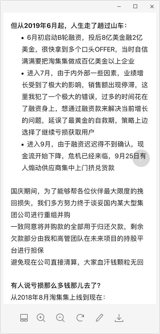 记者注意到,张正平在10月15日公开发表了《致伙伴们的一封道歉信》(下称道歉信),称在6月的融资中,他拿到了很多口头offer(协议),并自信的想要把淘集集做成百亿美元以上(体量的)企业。