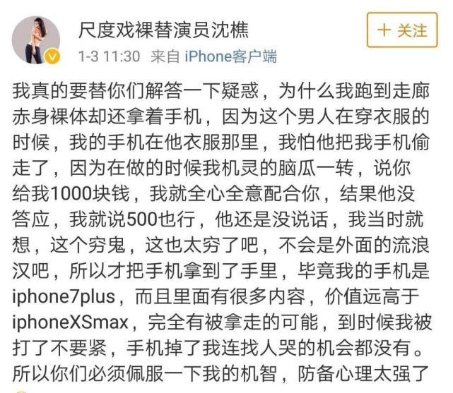 在沈樵的个人社交平台的认证中,可以知道她是一个裸替,在她的描述中,大家也可以知道整个事情的发生过程,她表示,在自己助理出门去打电话的时候,她也在打开房门自拍,但是没有想到之后会有歹徒直接闯进来,并且反锁了房门,之后更是对自己进行了性侵行为。